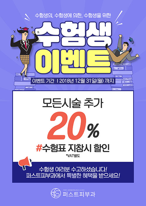 수험생이벤트 페이지 정보 퍼스트피부과 등록일 18-12-28 00:00 조회 982회 이벤트 기간 18년 11월 01일 ~ 18년 12월 31일 이전글 다음글 목록 본문 수험생이벤트