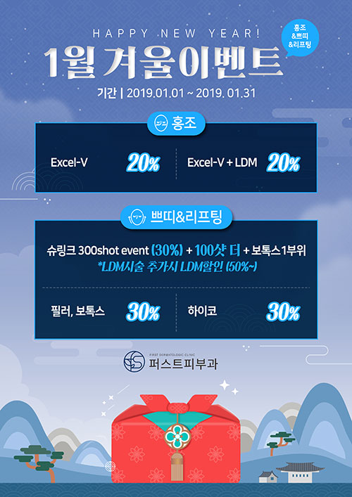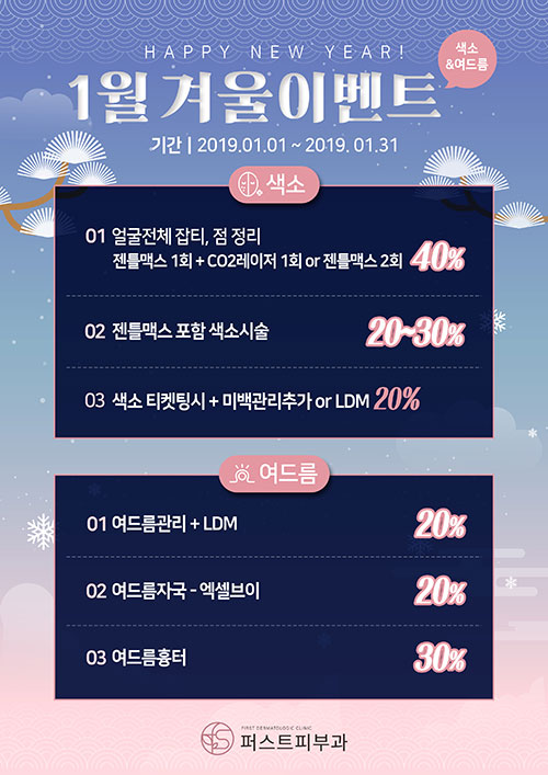 1월 겨울이벤트 페이지 정보 퍼스트피부과 등록일 18-12-31 00:00 조회 1,198회 이벤트 기간 19년 01월 01일 ~ 19년 02월 01일 이전글 다음글 목록 본문 1월 겨울이벤트입니다. 많은 관심 부탁드립니다 : )