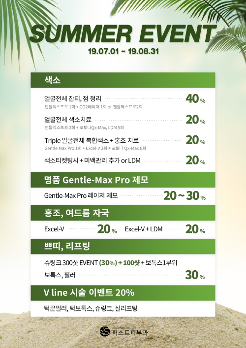 SUMMER EVENT! 페이지 정보 퍼스트피부과 등록일 19-07-01 00:00 조회 1,729회 이벤트 기간 19년 07월 01일 ~ 19년 08월 31일 이전글 다음글 목록 본문 SUMMER EVENT!