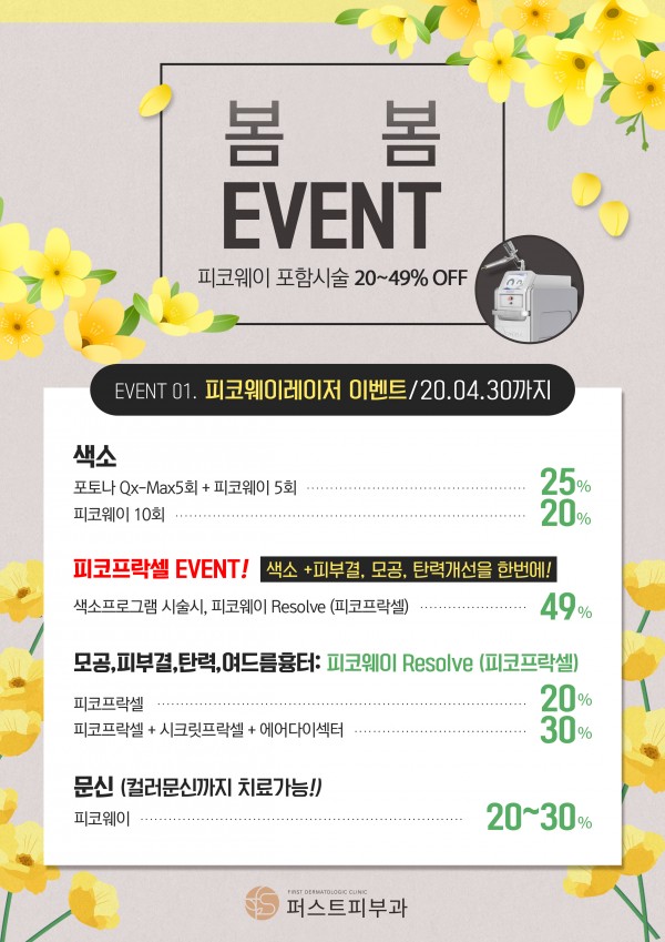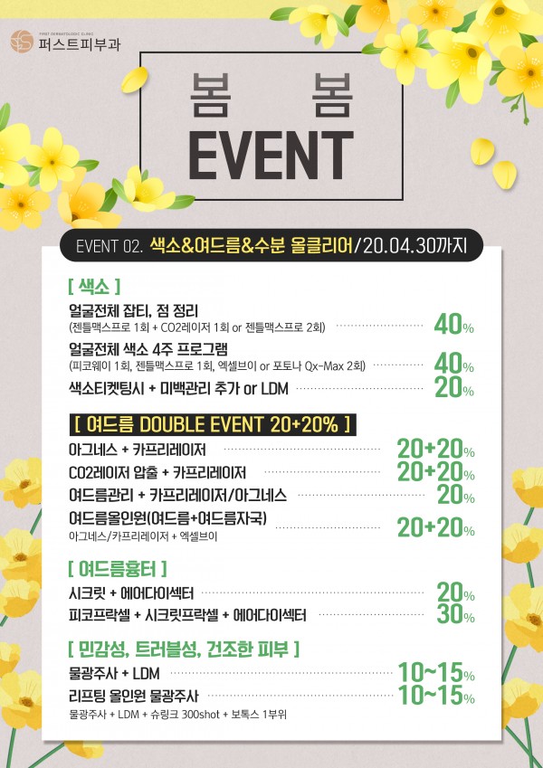 창원퍼스트피부과 3월~4월 이벤트 페이지 정보 퍼스트피부과 등록일 20-03-10 00:00 조회 2,015회 이벤트 기간 20년 03월 02일 ~ 20년 04월 30일 이전글 다음글 목록 본문 퍼스트피부과의 3~4월 이벤트 안내입니다.