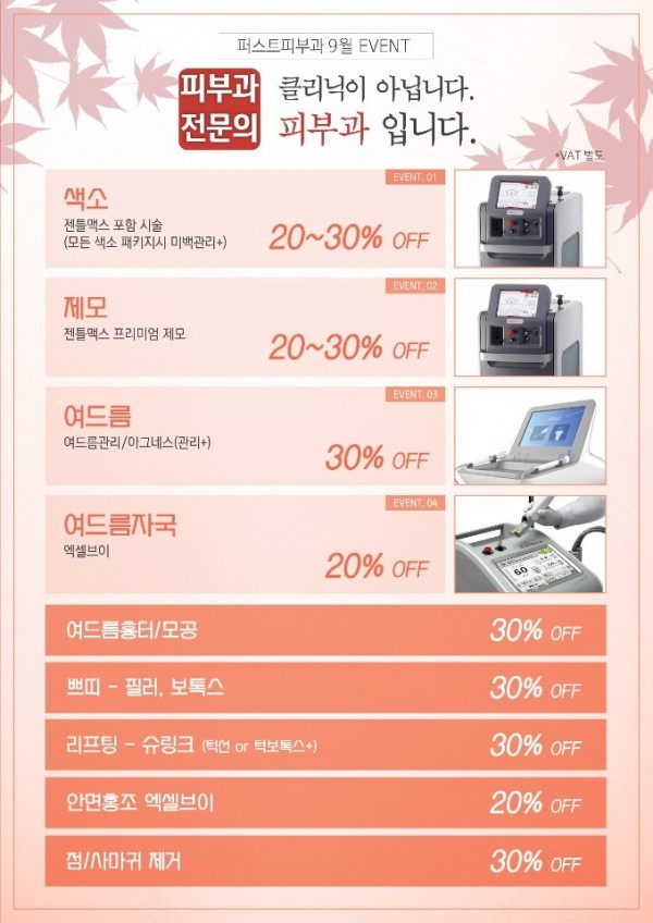 퍼스트 피부과 9월 이벤트 페이지 정보 퍼스트피부과 등록일 18-09-04 00:00 조회 1,139회 이벤트 기간 18년 09월 01일 ~ 18년 10월 31일 이전글 다음글 목록 본문 퍼스트 피부과 9~10월 이벤트 입니다.