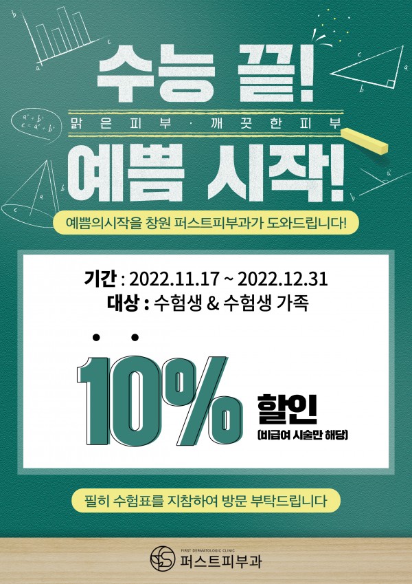2022년 수험생 이벤트 페이지 정보 퍼스트피부과 등록일 22-11-18 00:00 조회 1,615회 이벤트 기간 22년 11월 17일 ~ 22년 12월 31일 이전글 다음글 목록 본문 수험생 여러분 고생많으셨습니다. 퍼스트피부과에서는 수험생 및 가족 분들을 대상으로 수험표를 지참하신 분들에게 시술 할인을 진행중입니다.