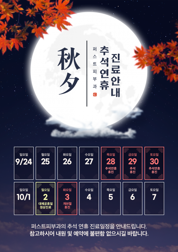 퍼스트피부과 2023 추석연휴 진료안내 페이지 정보 작성자 퍼스트피부과 작성일23-09-28 11:13 조회1,189회 댓글0건 관련링크 본문 퍼스트피부과의 추석연휴 진료일정을 안내드립니다. 다음글 목록