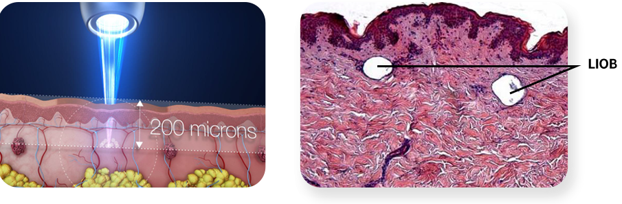 레이저조사시 만들어지는 플라즈마에 의해 진피내부에 폭발적인 기화반응과 물리적인 팽창이 일어나고 그 결과 진피내 수많은 공동 (cavitation)이 만들어지는 LIOB(Laser induced optical breakdown)현상을 이용하여 여드름 흉터조직을 효과적으로 박리가능하며 새로운 콜라겐 재생을 유도할 수 있습니다.
