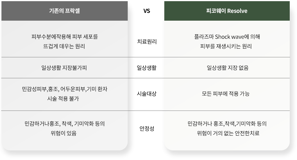 - 기존의 프락셀 : 피부표면에서 레이저를 조사하여, 표피손상과 함께 피부장벽손상이 동반됨표면손상으로 인한 딱지발생, 민감성피부, 홍조발생, 심한 통증 등으로 일상생활에 지장이 있음