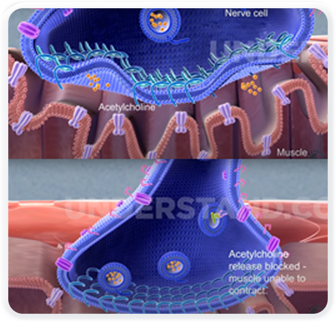 보톡스는 신경-근육 접합부에 작용하여 근육을 수축시키는 아세틸콜린의