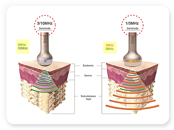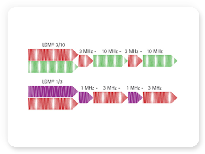 LDM은 Dual frequency 초음파기술을 통해 1MHz, 3Mhz, 10MHz 각각의 다른 두 주파수를 결합시켜