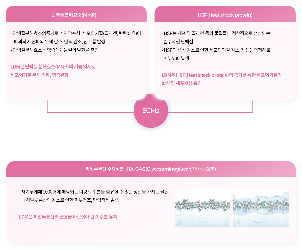 일반적인 초음파의 효과와 함께 LDM의 특별한 세포외기질(ECM) 균형 회복을 통해 탄력회복, 항염효과, 피부장벽회복, 약물침투증가가 가능하여 다양한 피부문제를 해결합니다.