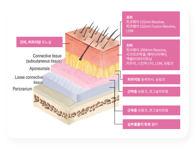 → 피코프락셀 532 Resolve, 532 Fusion Resolve (표피내 공동-LIOB형성을 이용한 표피재생), LDM (피부장벽기능의
