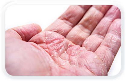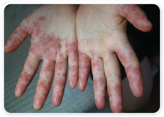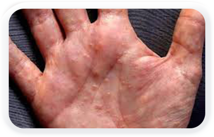 다양한 원인(스트레스,약물, 금속알러지,흡연,약물 등)에 의해 땀관 주위에 반복적으로 염증이 발생하는 손발 습진의 일종입니다.