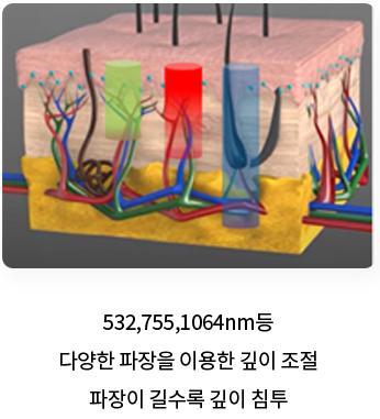1064nm : 진피깊은 부위까지 도달하는 파장으로 주로 굵고 깊은 푸른 혈관제거에 사용