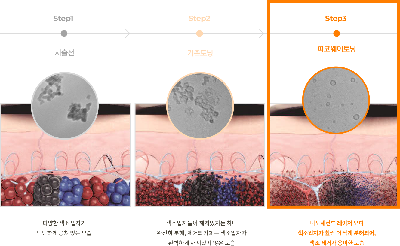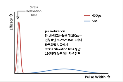 피코웨이 레이저는 450ps (피코세컨드, 1조분의 1초)를 이용하며 기존의 Q-witched Nd-Yag레이저의 5ns (나노세컨드, 1억분의1초)에 비해