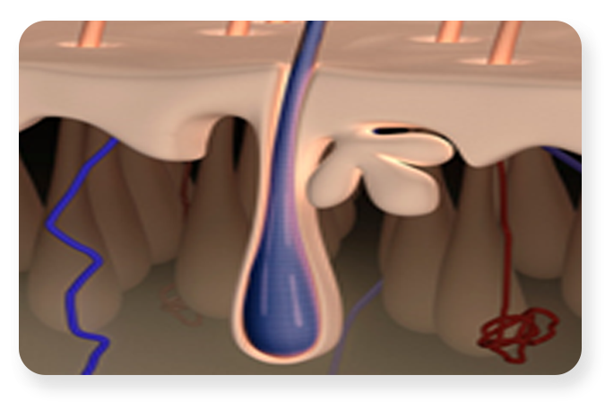 탄력이 감소된 모공 사이 피부조직에 비해 모공주위에 유착된 단단한 섬유조직이 모공을 더 도드라져 보이게 합니다.