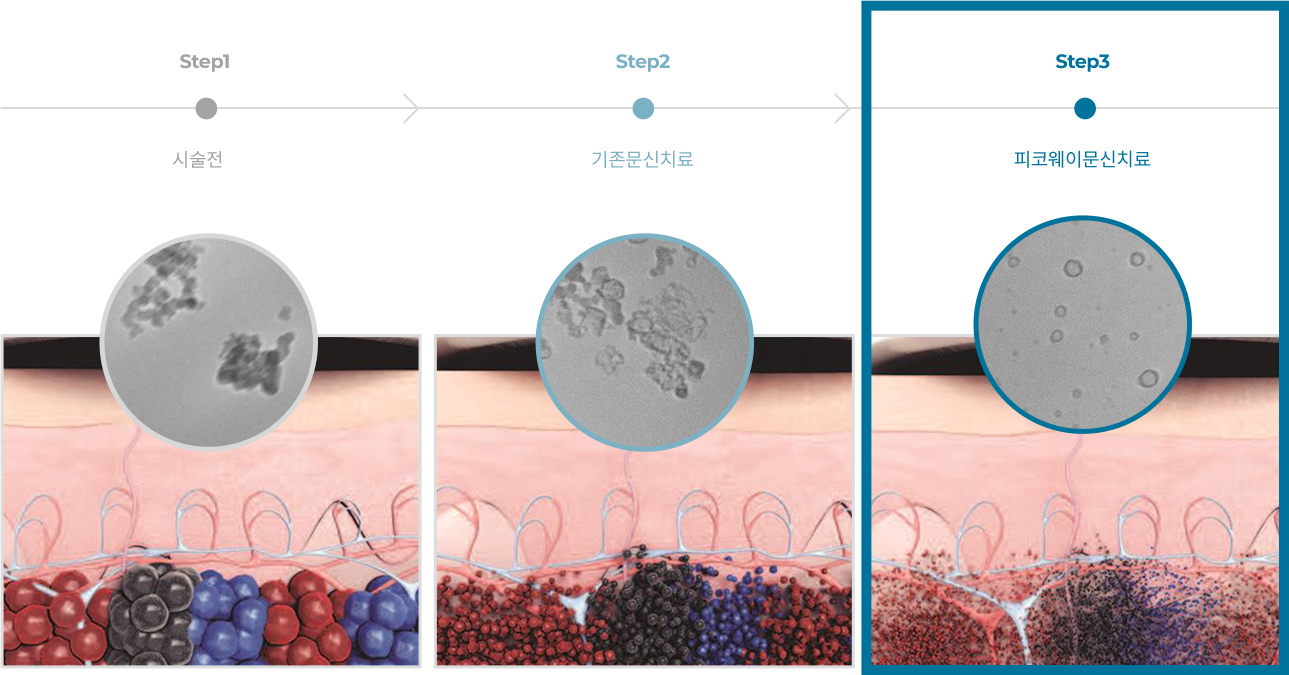 기존에 문신치료에 많이 사용하던 Q-switched Nd-Yag레이저는 조사시간이 피코레이저에 (1조분의1초) 비해